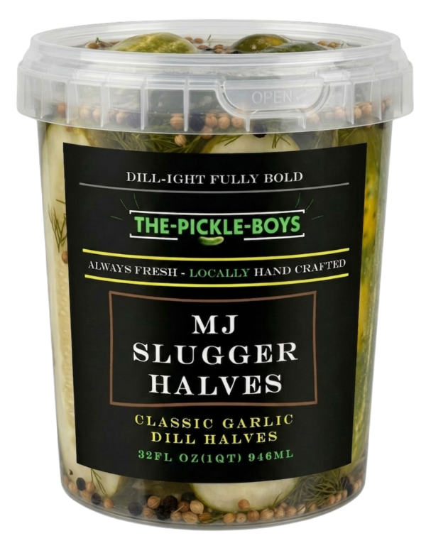 A 32-ounce container of summertime dill pickle halves offers a satisfying crunch with each bite. These thick, juicy pickle halves are submerged in a chilled, tangy brine that’s alive with the fresh, grassy pop of dill and spices. The gentle garlic undertones and perfect salty zing capture the essence of hot summer days at the ballpark. Each bite explodes with bright, puckery sourness and herbal dill refreshment, instantly evoking the crack of the bat, cheers from the stands.